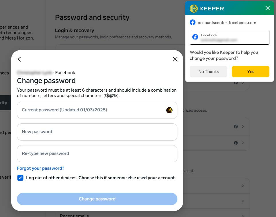 - Follow the On-screen instructions. If Keeper already knows your current Facebook password, it will have you click on the Current Password field and populate it for you. Keeper will then have you click on the other fields and generate a secure password. Follow the steps carefully and Keeper will save the password, and then click Change Password on Facebook to finish the process. If you run into issues with this, please see the notes below labeled “Some Sites Need to Be Manually Updated.”